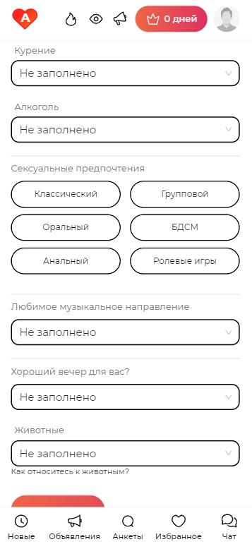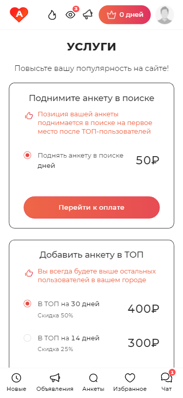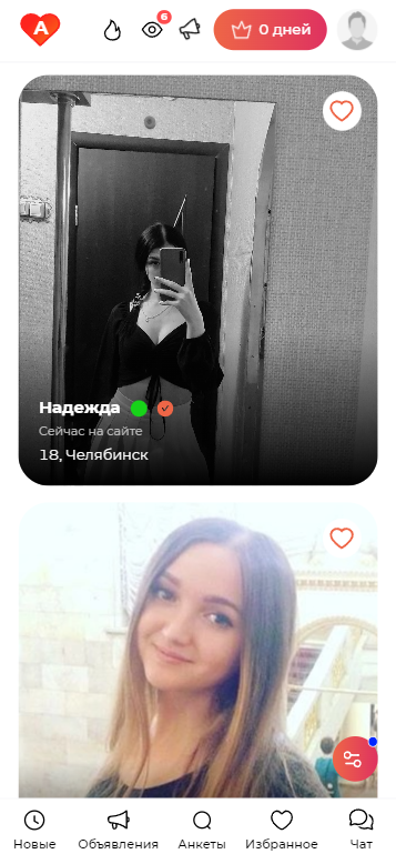 - анкеты, где предлагается посмотреть имеющиеся профили и отсортировать их по своим предпочтениям