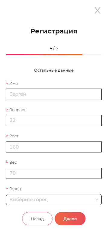 Система спрашивает цель отношений: поиск спонсора, содержанки, серьезных отношений или разовой встречи. После этого требуется ввести основные показатели пользователя, которые будут видны остальным: имя, возраст, рост, вес и город проживания.