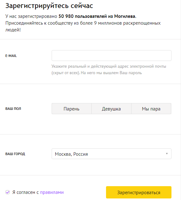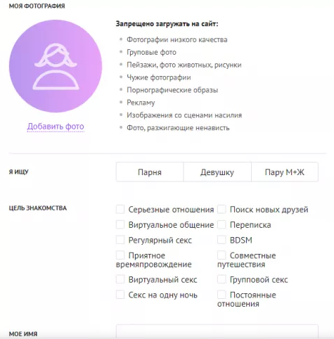 Затем сервис предложит заполнить небольшую анкету: загрузить фото, выбрать цель знакомства, предпочтения и т.д. Следующий шаг – активация, через письмо на электронную почту. После этого будет доступен полный функционал сайта.