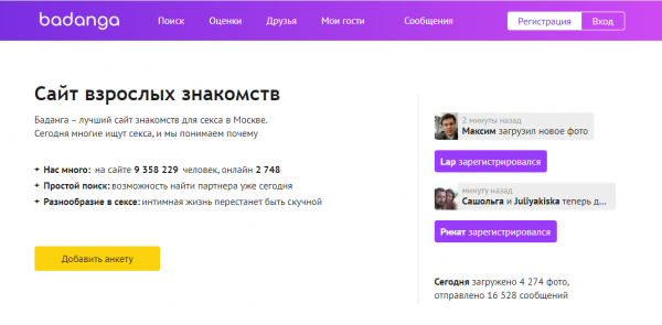 Свободные отношения давно стали популярны, но в силу порицания общества, моральных устоев и природной скромности люди часто ограничивают себя в сексе, поэтому сайт предоставил своим пользователям полную свободу действий. Причины регистрации могут быть разными (быстрый секс, эротические вечеринки и эксперименты, новый опыт и другое), но цель знакомств на баданге одна – легкий и быстрый интим без обязательств.