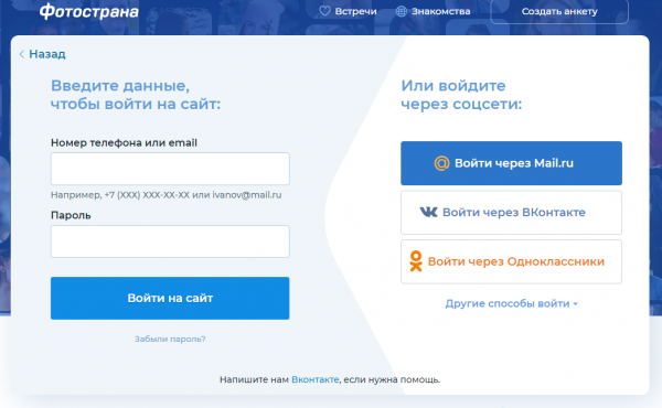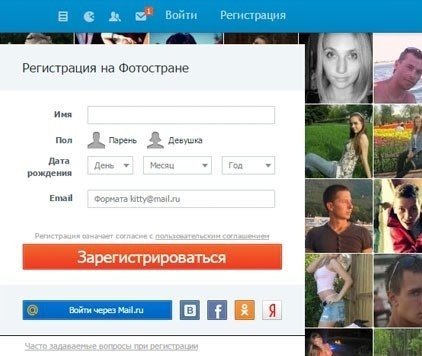 Знакомства на Фотостране происходят после регистрации, которая подразумевает заполнение стандартной формы. Регистрация также возможна через соцсети, что значительно упрощает процесс. Этот способ не требует дополнительно придумывать логин и пароль для доступа.