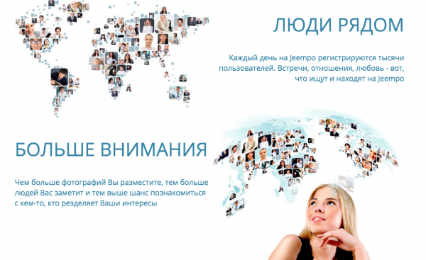 «Jeempo» – сервис для знакомств в интернете, позволяющий бесплатно находить девушек и парней, с которыми можно не только общаться, но и строить серьезные отношения. Здесь ежедневно регистрируется большое количество пользователей, которые ищут онлайн знакомства, чтобы устроить свою личную жизнь. Некоторые из них готовы на встречи без обязательств. В анкетах с фото можно быстро найти приятных людей, с которыми захочется познакомиться не только для онлайн переписок. Сайт Jeempo является один из немногих сервисов для знакомств, на котором можно быстро познакомиться с мужчинами и женщинами для реальных встреч.