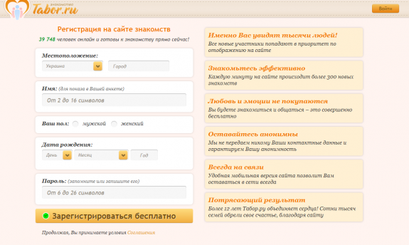 Регистрация на сайте Табор занимает несколько минут, подразумевает добавление на страницу личных фото и информации о себе, которая позволит найти вас подходящим партнерам.